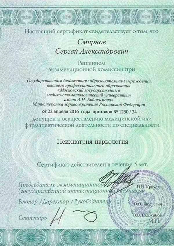 • 2018 г. — Сертификат специалиста: ФГБОУ ВО «РНИМУ имени Н.И. Пирогова» Минздрава России (психиатрия-наркология).